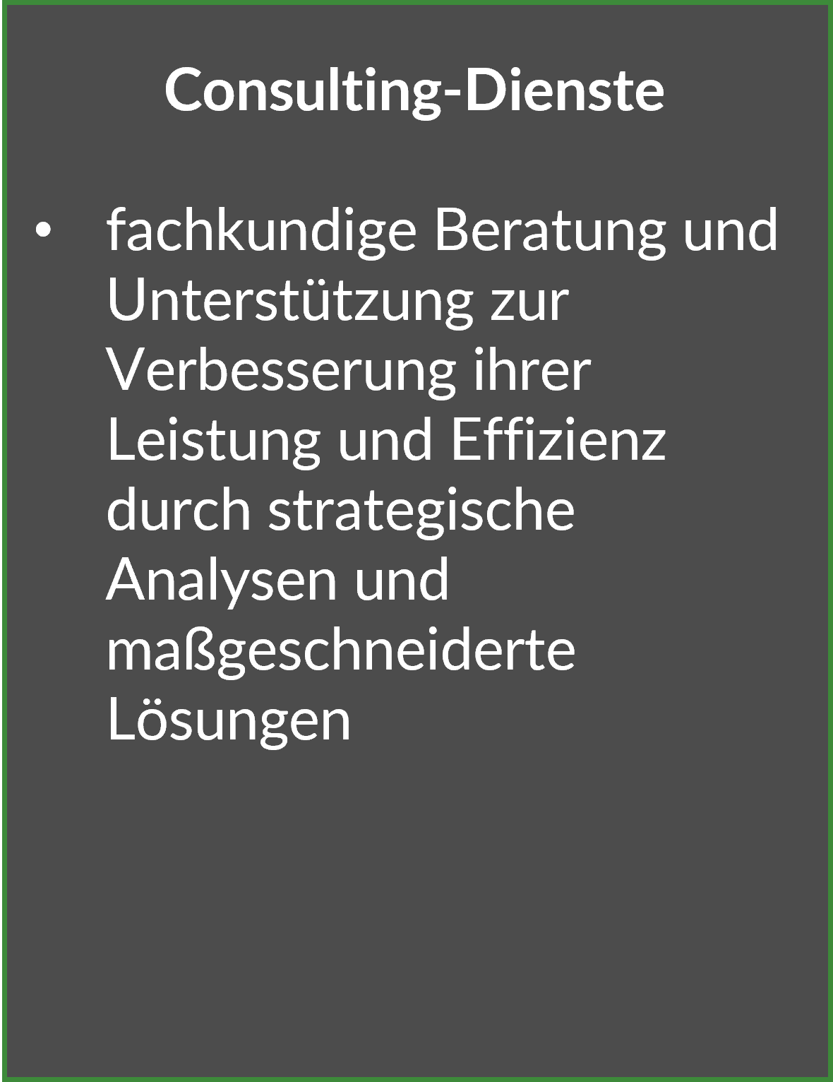 Wir sind Ihre Partner für maßgeschneiderte Beratungsdienste und innovative Lösungen. Mit jahrelanger Erfahrung in den Bereichen Unternehmensstrategie, Prozessoptimierung und digitaler Transformation unterstützen wir Unternehmen dabei, ihre Ziele effizient und nachhaltig zu erreichen. Unsere maßgeschneiderten Lösungen sind genau auf Ihre Bedürfnisse und Anforderungen zugeschnitten. Vertrauen Sie auf unser Know-how und lassen Sie uns gemeinsam Ihre Vision verwirklichen!